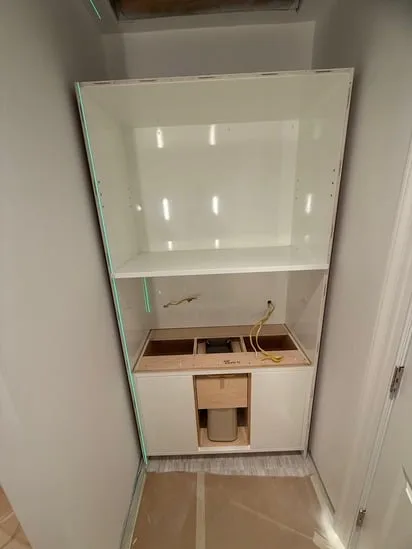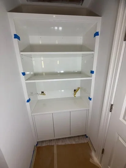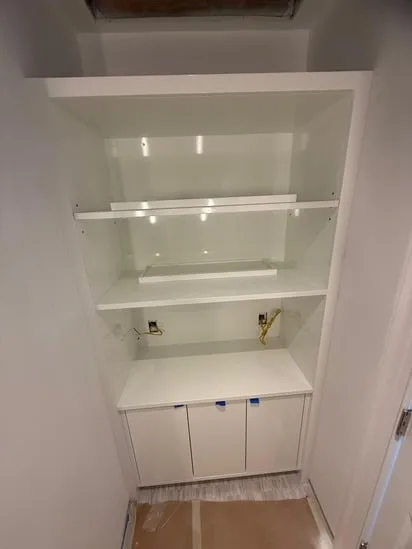 This project involved a complete custom built-in cabinet installation, beginning with the preparation of the recessed wall area where the unit would be constructed. Initially, the space was measured and marked to ensure the cabinet frame would fit precisely within the existing opening.